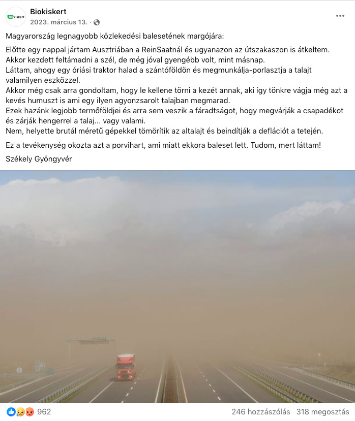 Ha bárki kimegy a határba, láthatja, hogy az értékes termőtalaj tonnái hogyan szállnak el a levegőbe az első nagyobb széllel, benne a szerves szénnel, a humusszal, a felszínre kiszórt műtrágya maradékával, ami nem gázosodott el a korábbi száraz időszakban. Sőt, a növényvédőszer maradványokkal együtt is ezt a levegőt szívjuk mindannyian a Kárpát medencében…